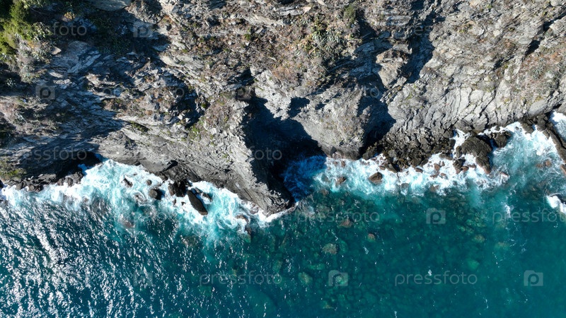 Аэрофотосъемка бирюзовых океанских вод, омывающих скалистую береговую линию
