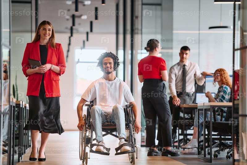 Руководитель бизнеса со своим коллегой, афроамериканским бизнесменом, который является инвалидом, проходят мимо своих коллег, работающих в современных офисах