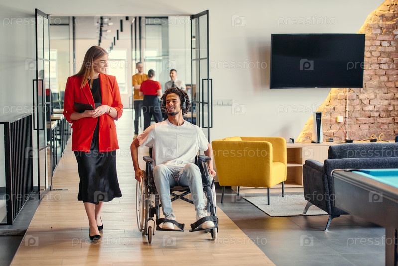 Руководитель бизнеса со своим коллегой, афроамериканским бизнесменом, который является инвалидом, проходят мимо своих коллег, работающих в современных офисах