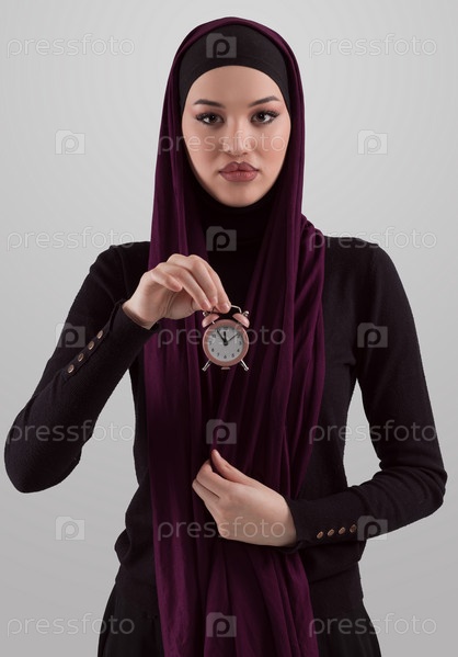 Красивая арабская бизнесвумен в хиджабе и держит маленькие часы. Время идет, и это концепция давления