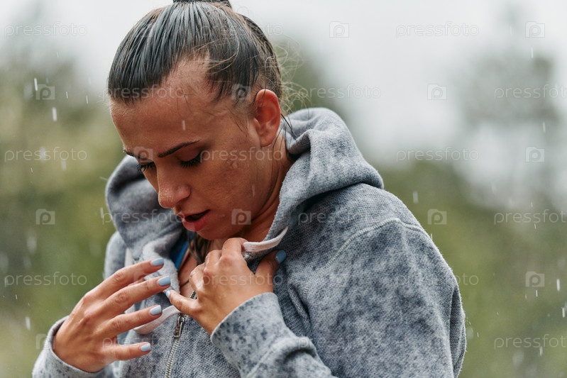 Женщина отдыхает под дождем после интенсивной пробежки