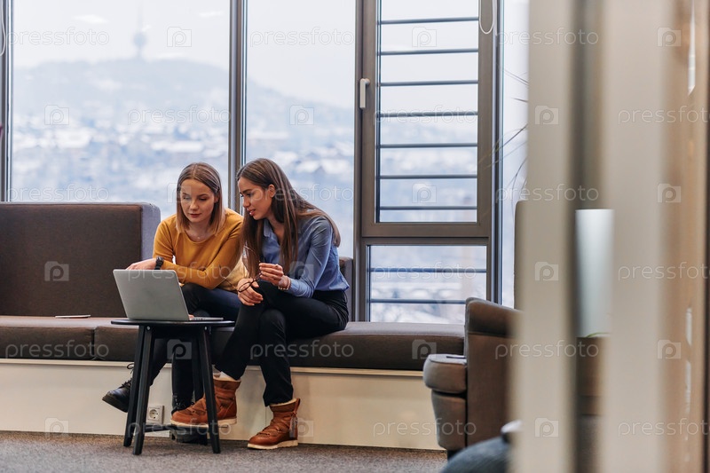 Коллеги по бизнесу проверяют работу на ноутбуке во время перерыва