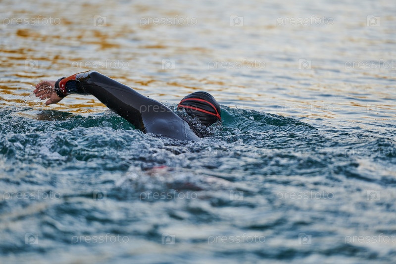 Триатлонист плывет по озеру на рассвете в гидрокостюме