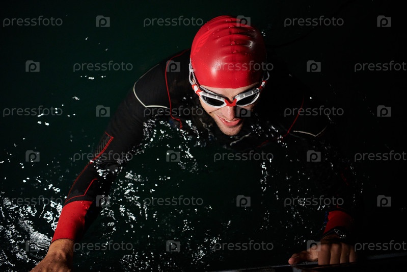 Триатлонист находит безмятежное восстановление сил в озере, наслаждаясь спокойствием воды после интенсивной тренировки
