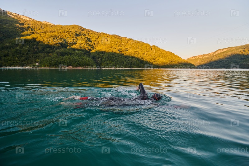 Триатлонист плывет по озеру на рассвете в гидрокостюме