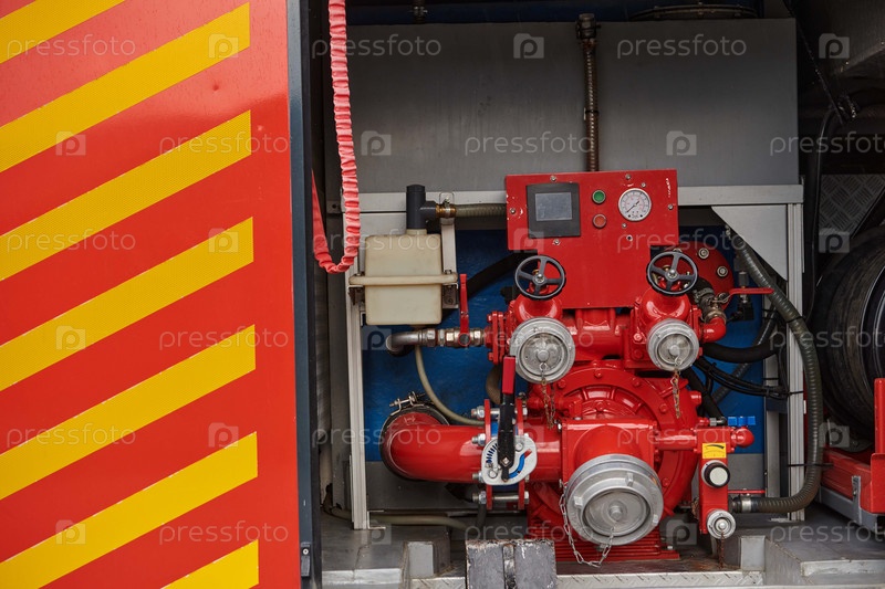 Крупный план основного противопожарного оборудования на современной пожарной машине, демонстрирующий инструменты и снаряжение, готовые к экстренному реагированию на опасные пожары