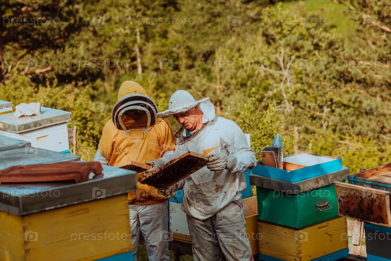 Пчеловоды проверяют мед на рамке улья в поле. Владельцы малого бизнеса на пасеке. Производитель натуральной здоровой пищи работает с пчелами и ульями на пасеке
