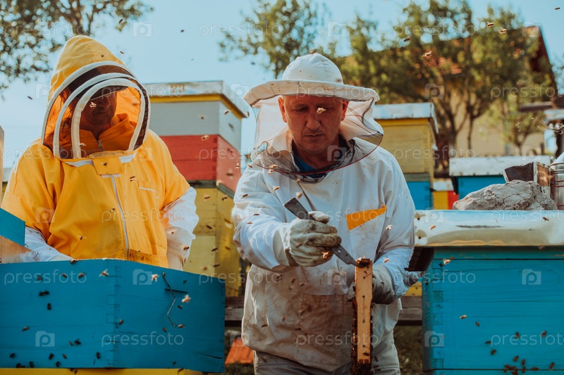 Пчеловоды проверяют мед на рамке улья в поле. Владельцы малого бизнеса на пасеке. Производитель натуральной здоровой пищи работает с пчелами и ульями на пасеке
