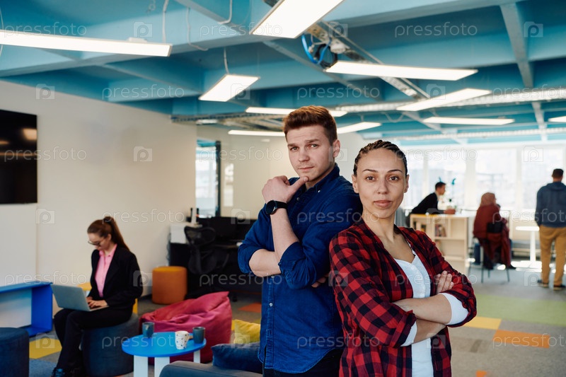 Портрет успешного творческого бизнесмена и бизнесвумен, смотрящих в камеру и улыбающихся. Разные деловые люди стоят вместе на стартапе