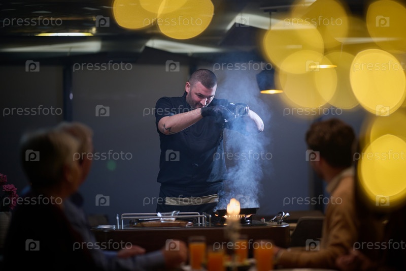 В ресторане профессиональный шеф-повар представляет гостям жареный стейк, приготовленный на открытом огне, в то время как европейская мусульманская семья с нетерпением ждет ифтара во время священного месяца Рамадан, сочетая кулинарное мастерство с культур