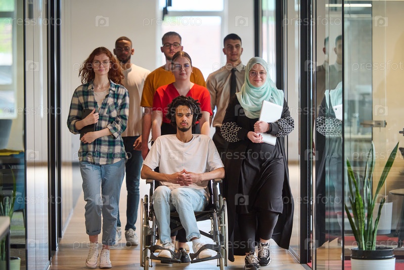 Разнообразная группа молодых бизнесменов собирается в современном офисе стартапа со стеклянным ограждением, демонстрируя инклюзивность: среди них есть человек в инвалидной коляске, афроамериканский молодой человек и мусульманка в хиджабе