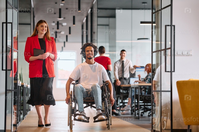 Руководитель бизнеса со своим коллегой, афроамериканским бизнесменом, который является инвалидом, проходят мимо своих коллег, работающих в современных офисах