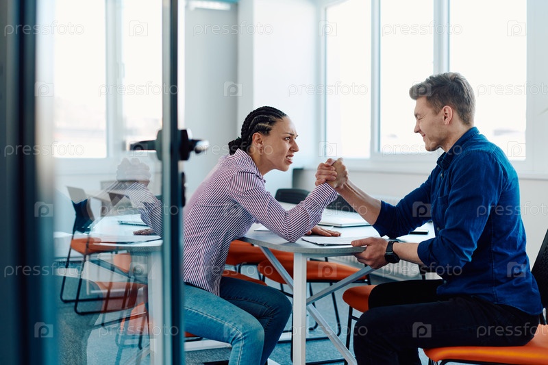 В современном офисе стартапа бизнесмен и его коллеги по бизнесу устраивают символический поединок по армрестлингу, отражающий командную работу, конкуренцию и инновации в их динамичном рабочем пространстве