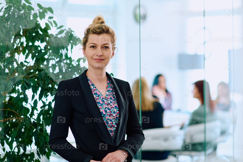 Портрет светловолосой деловой женщины в современном офисе с ее рабочим пространством и коллегами на заднем плане