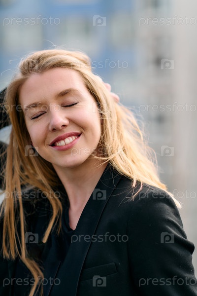 Портрет стильной деловой блондинки, позирующей на террасе в городском пейзаже