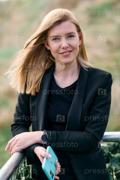 Блондинка-бизнесвумен в черном костюме использует смартфон во время перерыва в современной городской среде