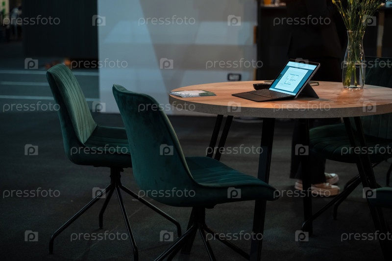 Цифровой планшетный компьютер, размещенный на деревянном столе в современном офисе
