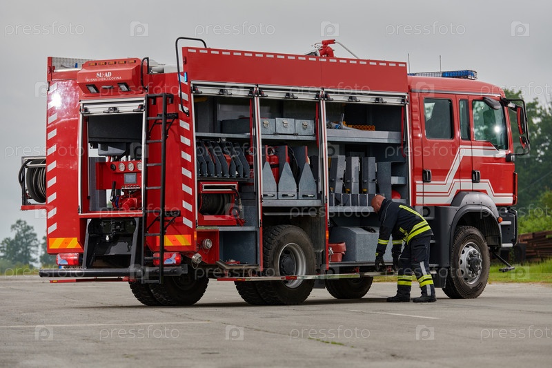 Пожарный тщательно готовит современную пожарную машину к эвакуации и реагированию на опасные ситуации, демонстрируя предельную преданность безопасности и готовность к возникновению пожара