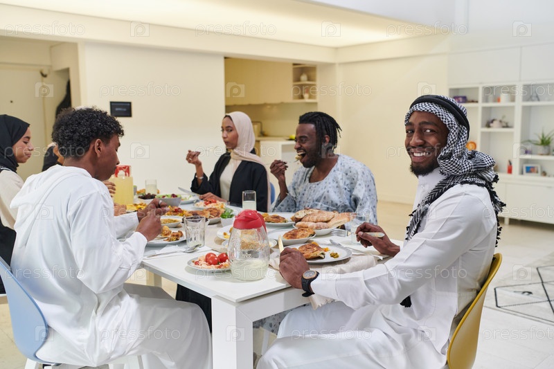 Традиционная и разнообразная мусульманская семья собирается вместе, чтобы разделить вкусную трапезу ифтар во время священного месяца Рамадан, воплощая суть семейной радости, культурного богатства и духовного единства в их общем праздновании