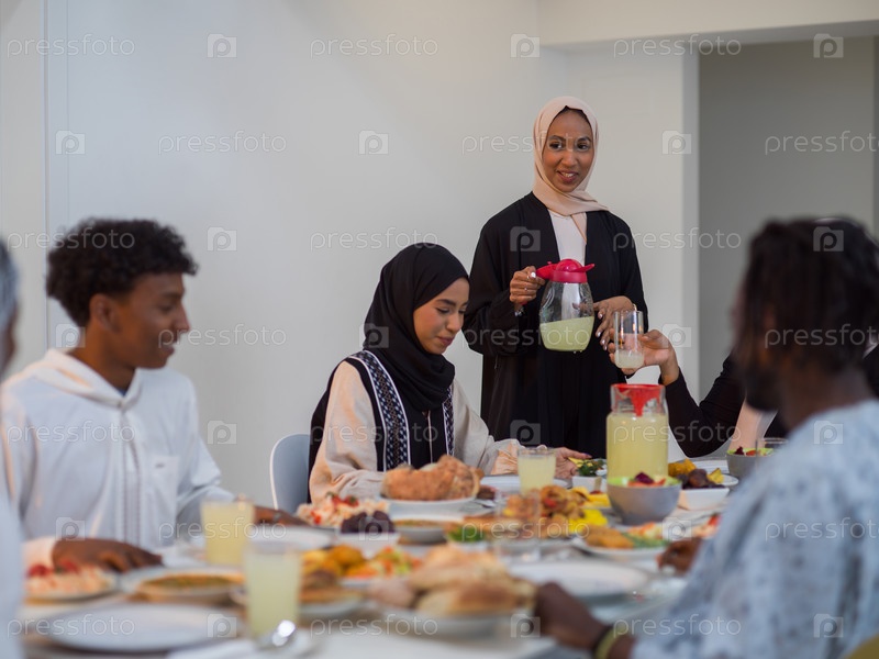Разнообразная исламская семья собирается на ифтар, радостно прерывая пост во время Рамадана, а мусульманка в красивом хиджабе изящно льет воду, чтобы отметить окончание поста, демонстрируя единство, любовь и духовную связь, которые определяют этот особый
