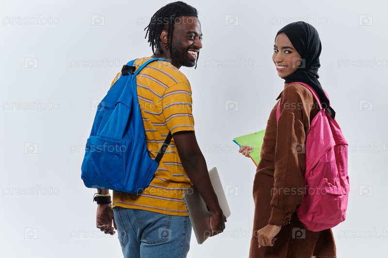 Афроамериканский студент сотрудничает со своей коллегой-мусульманкой, которая усердно работает на своем ноутбуке, символизируя сочетание разнообразия, современного обучения и духа сотрудничества на спокойном белом фоне