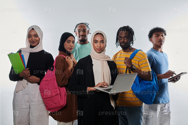Группа разнообразных студентов занимается современными образовательными практиками, используя разнообразные технологические инструменты, такие как ноутбуки, планшеты и смартфоны, на чистом белом фоне, демонстрируя современный подход к совместному обучению