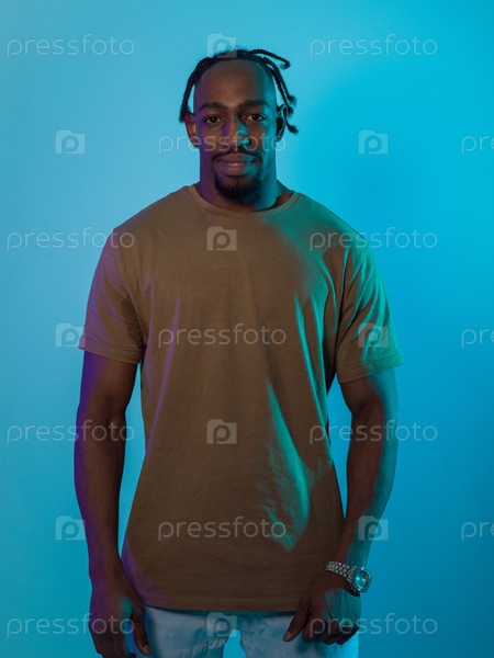 Афроамериканец с современной и изысканной прической уверенно стоит на ярком синем фоне, демонстрируя сочетание современной моды и культурной самобытности с элегантностью и харизмой