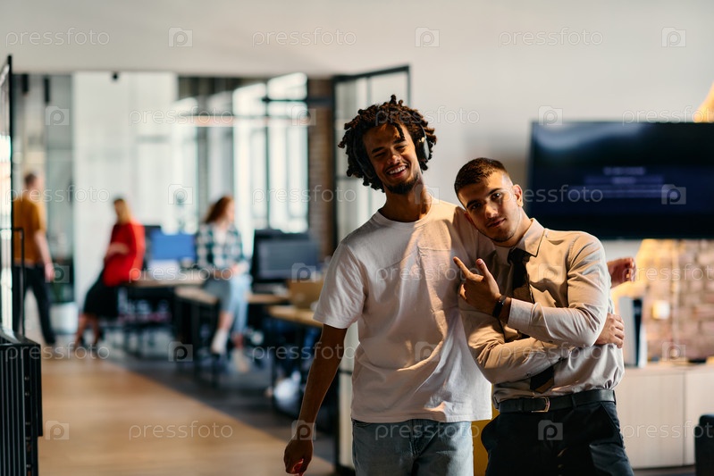 Группа коллег, включая афроамериканского бизнесмена и молодого лидера в рубашке и галстуке, позируют вместе в современном офисе коворкинг-центра, представляя собой динамичное сочетание профессионализма и сотрудничества