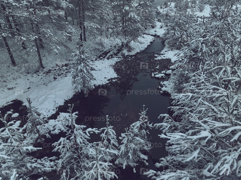 Удивительный кинематографический вид с воздуха на замерзающую реку. Полет с воздуха над замерзшим ручьем. Живописный вид на природу
