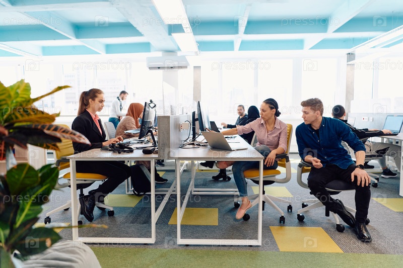 Совместный процесс многонациональной квалифицированной молодой бизнес-команды во время мозгового штурма в офисе. Разнообразная группа молодых людей, одетых в официальную одежду, сотрудничает в разработке дизайн-проекта