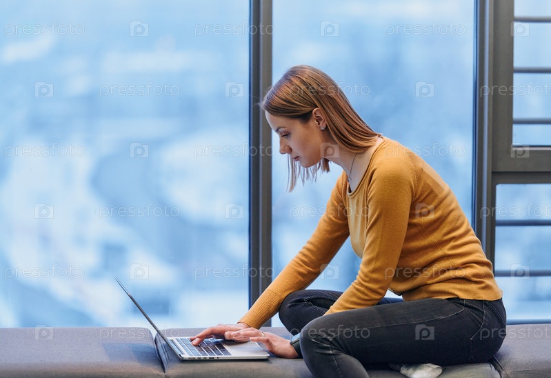 Деловая женщина пользуется ноутбуком, сидя у окна большого корпоративного здания, на фоне которого открывается живописный вид на городской пейзаж