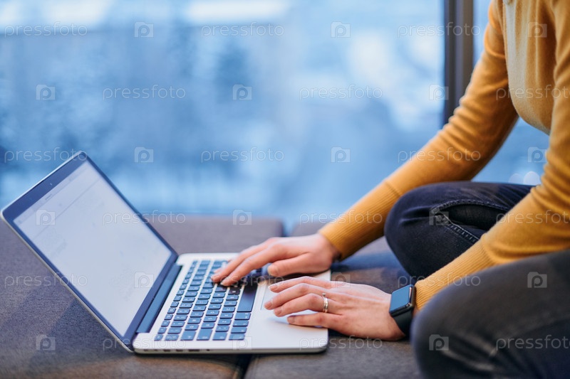 Деловая женщина пользуется ноутбуком, сидя у окна большого корпоративного здания, на фоне которого открывается живописный вид на городской пейзаж