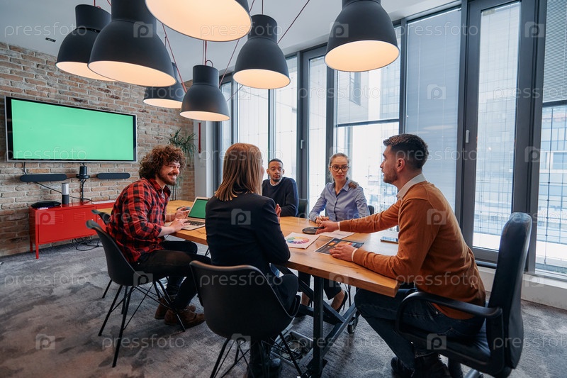 В яркой атмосфере современного офиса стартапа разнообразная команда профессионалов в сфере бизнеса участвует в обсуждениях различных проектов и разрабатывает новые бизнес-стратегии, олицетворяя креативность и инновации в предпринимательской среде