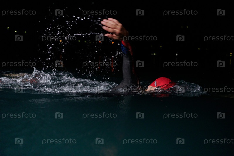 Целеустремленный профессиональный триатлонист проходит интенсивные ночные тренировки в холодной воде, демонстрируя самоотверженность и выносливость в рамках подготовки к предстоящим соревнованиям по триатлону