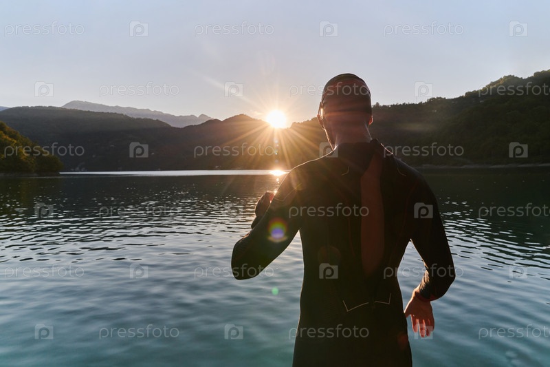 Настоящий триатлонист готовится к тренировке по плаванию на озере