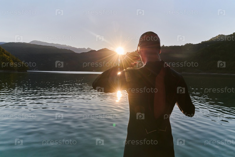 Настоящий триатлонист готовится к тренировке по плаванию на озере