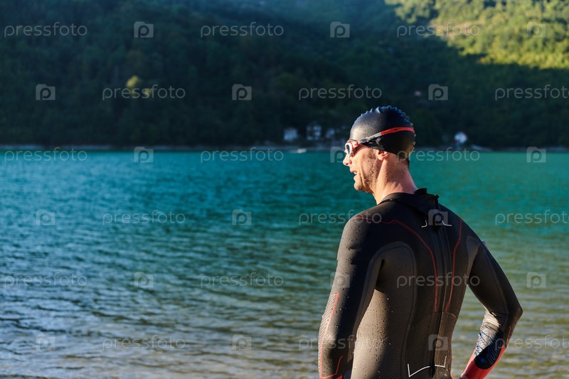 Настоящий триатлонист готовится к тренировке по плаванию на озере