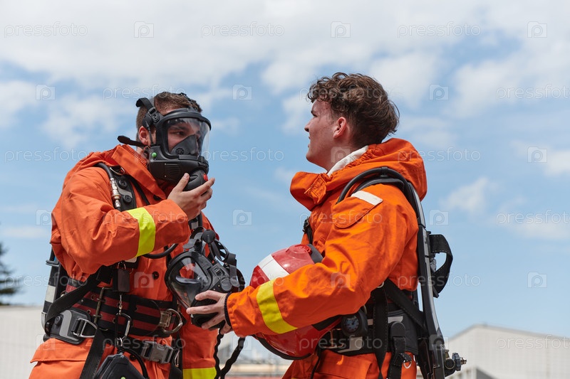 Сплоченная команда пожарных, облаченных в форму, принимает участие в душевном праздновании, отмеченном торжественными салютами и криками «ура», олицетворяя радость и благодарность после успешного завершения сложной пожарной операции