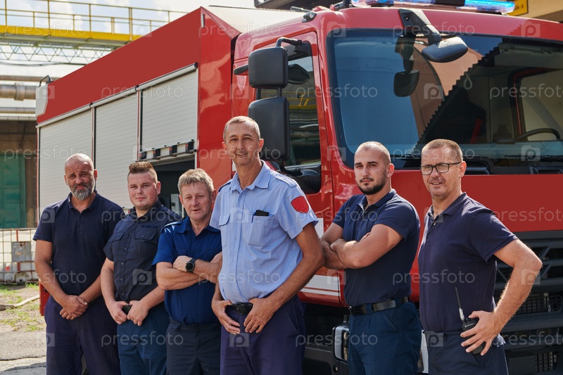 Опытная и преданная своему делу профессиональная пожарная команда с гордостью позирует перед своей современной пожарной машиной, демонстрируя свое современное оборудование и приверженность обеспечению общественной безопасности