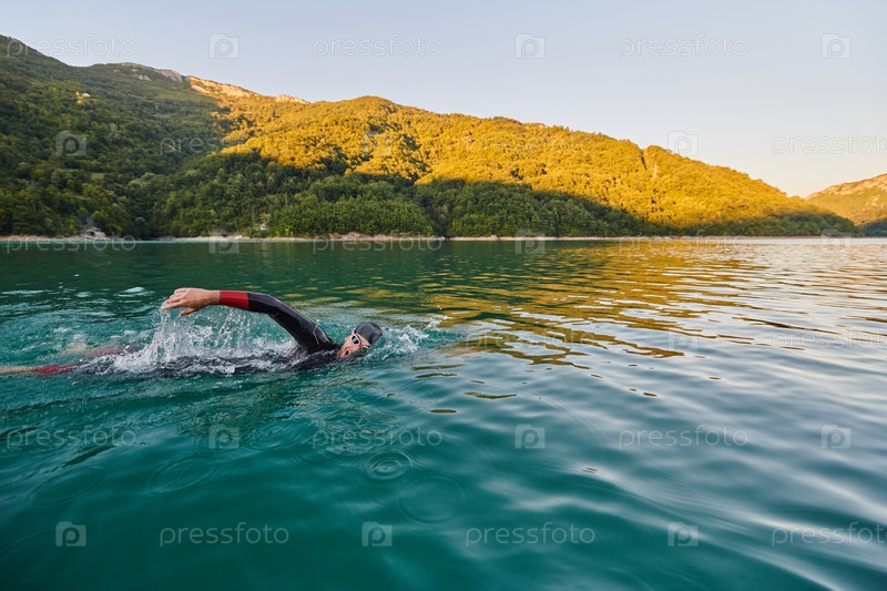 Триатлонист плывет по озеру на рассвете в гидрокостюме