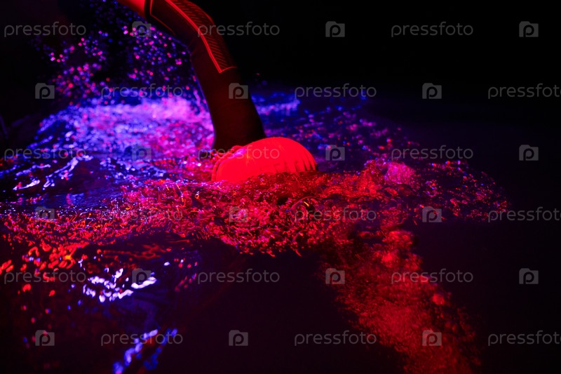 Настоящий пловец-триатлонист отдыхает во время интенсивной тренировки под ночным неоновым гелем