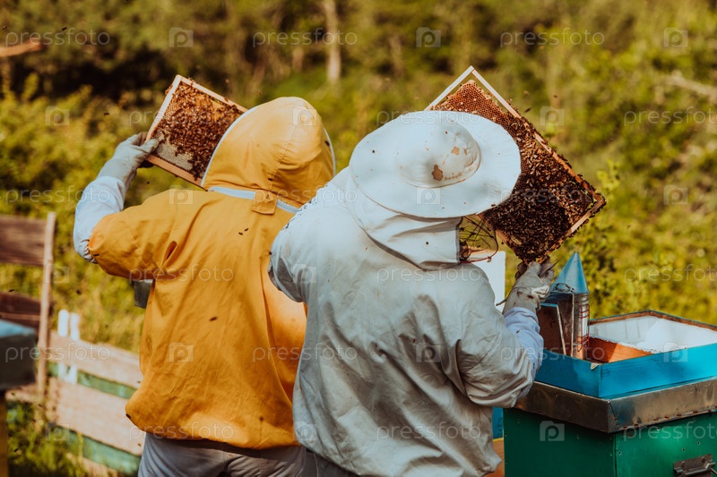 Пчеловоды проверяют мед на рамке улья в поле. Владельцы малого бизнеса на пасеке. Производитель натуральной здоровой пищи работает с пчелами и ульями на пасеке