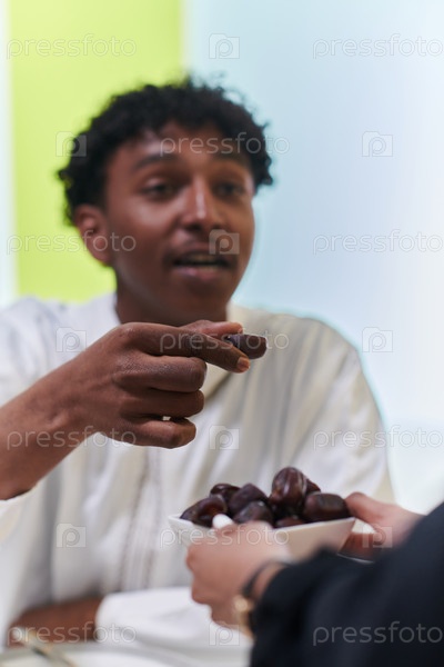 Афроамериканец-мусульманин деликатно берет финики, чтобы прервать пост во время месяца Рамадан, сидя за семейным обеденным столом, олицетворяя сцену духовного размышления, культурных традиций и общего ожидания общественного ифтара