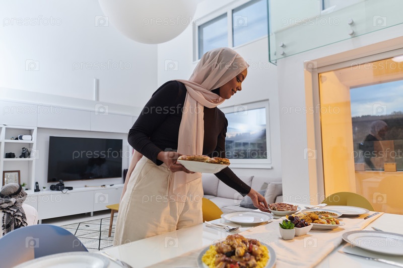 Молодая арабская женщина грациозно готовит ифтар для своей семьи, изящно сервируя стол в священный месяц Рамадан, передавая суть семейной радости, культурных традиций и духовной преданности