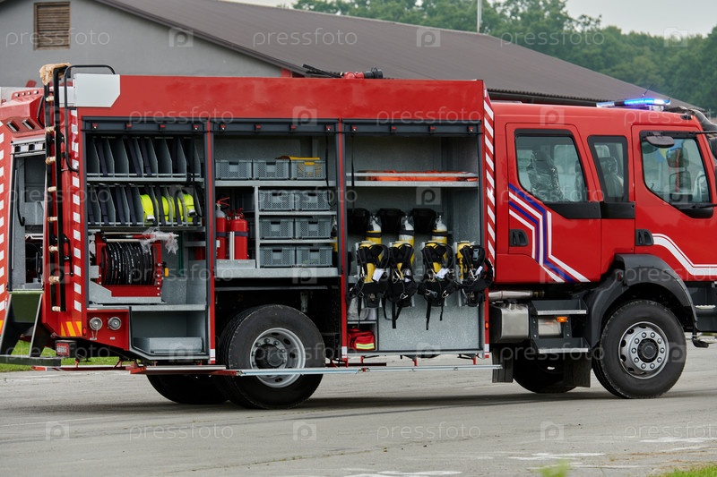 В этой захватывающей сцене современная пожарная машина, оснащенная передовыми спасательными технологиями, стоит наготове вместе со своей опытной пожарной командой, готовой вмешаться и быстро отреагировать на чрезвычайные ситуации, обеспечивая безопасность