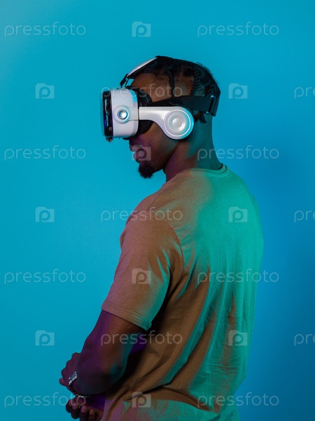 В футуристическом визуальном образе афроамериканец стоит в одиночестве на ярком синем фоне, украшенный очками виртуальной реальности, которые переносят его в передовой опыт виртуальной реальности, объединяющий технологии и инновации в современном представ