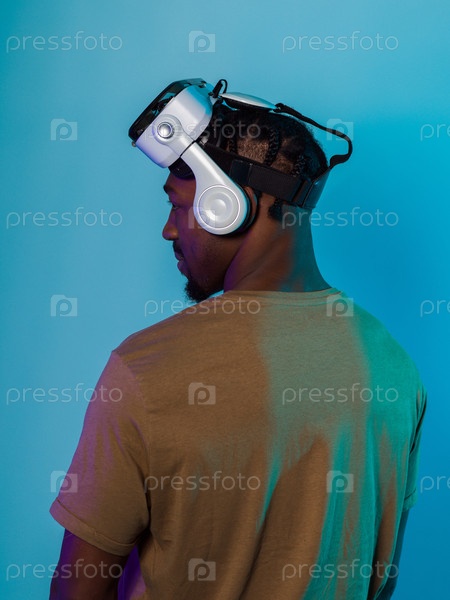 В футуристическом визуальном образе афроамериканец стоит в одиночестве на ярком синем фоне, украшенный очками виртуальной реальности, которые переносят его в передовой опыт виртуальной реальности, объединяющий технологии и инновации в современном представ