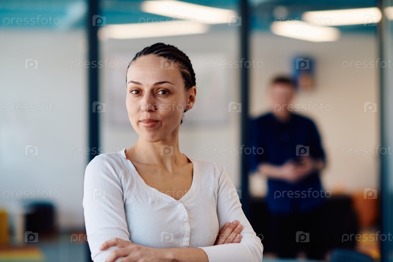 Портрет деловой женщины в креативном открытом пространстве коворкинга стартап-офиса со скрещенными руками. Успешная бизнес-леди стоит в офисе с копирайтом. На заднем плане работают коллеги