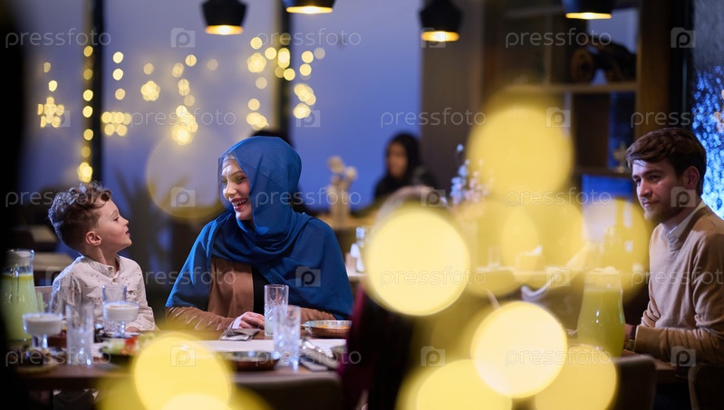 В современном ресторане исламская пара и их дети с радостью ожидают ифтара во время священного месяца Рамадан, воплощая семейную гармонию и культурное празднование в современной атмосфере обеда