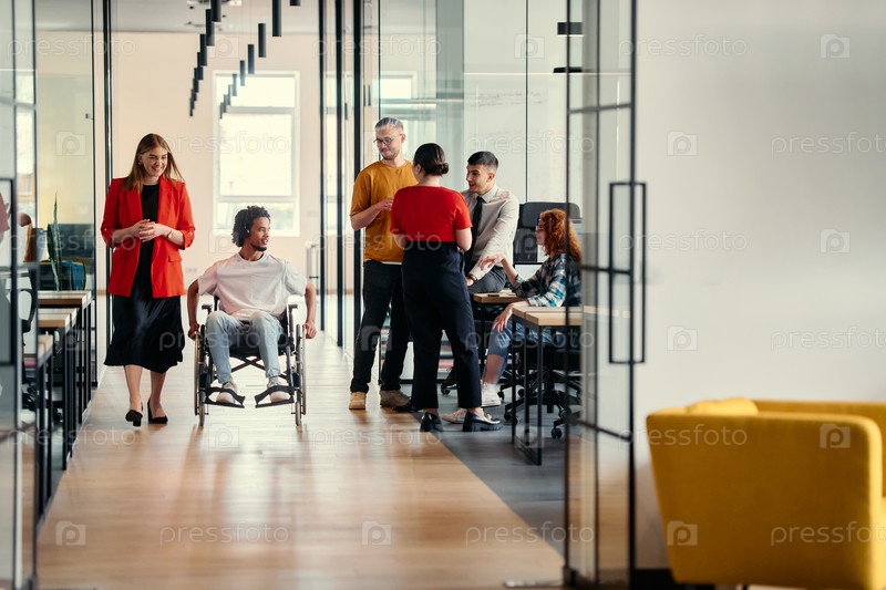 Разнообразная группа молодых специалистов, включая деловых женщин и афроамериканского предпринимателя в инвалидной коляске, совместно обсуждают различные бизнес-проекты в обстановке современного офиса стартапа
